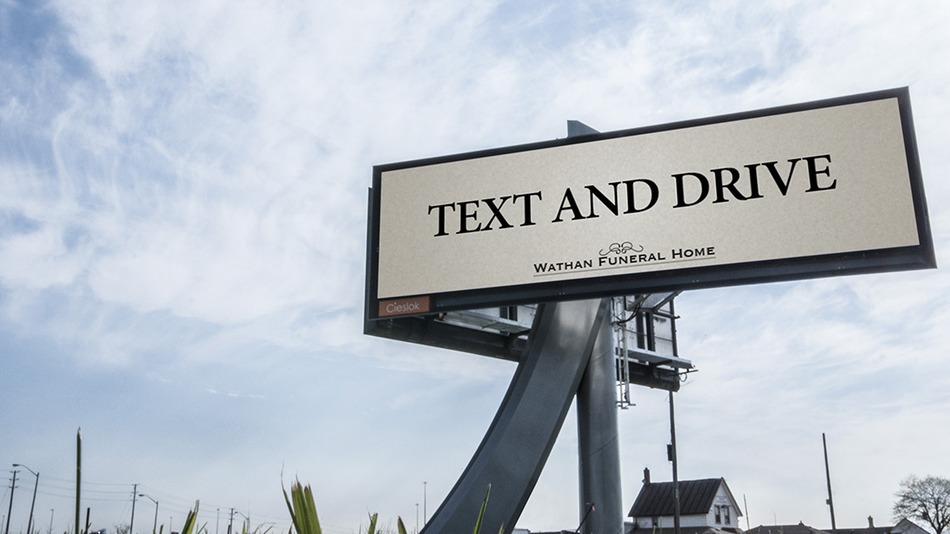 The ad’s bold text encourages drivers to text and drive – a message from a so-called Watham Funeral Home.