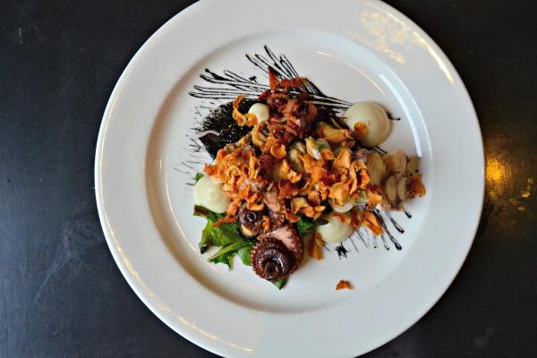 MacDonell explains that at The Farmhouse Tavern the menu is balanced in a meat, vegetable, seafood order, whereas at the Daughter it’s completely reversed. You don’t have to look much further than the creative and delicious octopus plate (octopus tentacles, octopus ‘sausage’, pancetta, mussels, marjoram, sunchoke purée, dandelion greens, squid ink vinaigrette) to get a sense of what we’re talking about. At brunch, your Black Caesar will come garnished with a piece of shrimp, your Frog n’ Waffles include (surprise, surprise) poached frog legs on buckwheat waffles with red wine maple butter. And you’ll find fresh oysters daily as well as a steamed clam salad that includes a mustard ice cream.