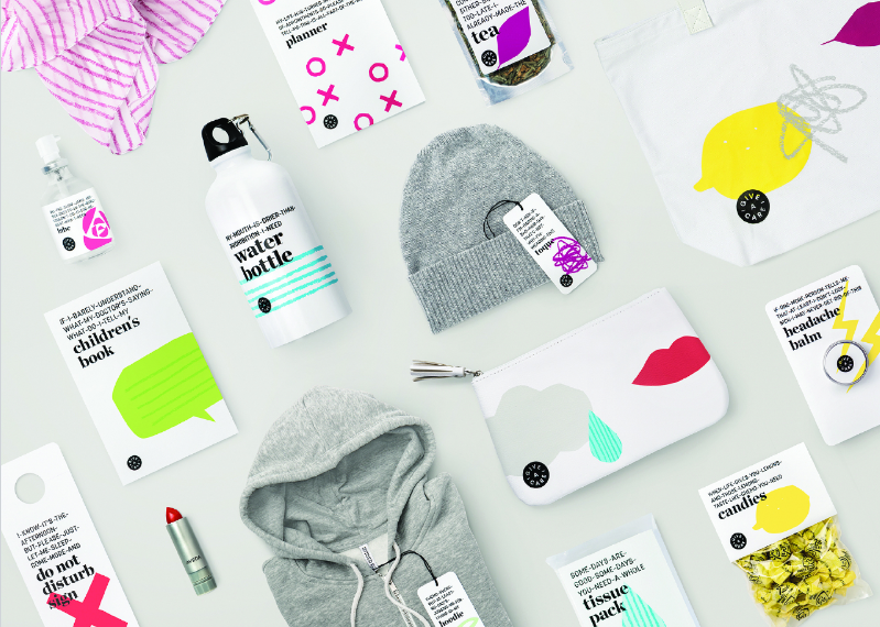 Developed with advice and input from Rethink Young Women’s Network of patients and survivors, the Give-A-Care collection includes cleverly-named products like lemon candies that mask the metallic taste of chemo, lube to help those with early menopausal symptoms, a children’s book to help educate kids on a parent’s diagnosis, a stylish zip-front hoodie that’s easy to wear post-surgery, to a few uplifting, fun items like conversation hearts and a power lipstick.