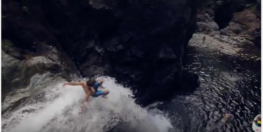 And recently, he and his collection of adventure seeking travellers hit up Lynn Canyon Park in B.C., a quick 20 minutes from downtown Van, to dive into one of nature’s greatest accomplishments – a slip ‘n slide that carves through centuries old rock before dropping you off of a 35 ft. high waterfall into what we can only assume is a pool comprised of happiness and dreams.