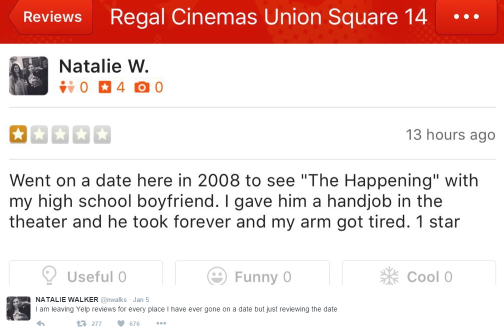 Woman Gives Hilarious Yelp Reviews Based on Past Dates at Locations